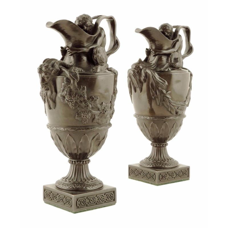 After John Flaxman (1755-1826). A pair of late 19th century bronze ewers, water modelled with Neptune and decorated with waves and a fish, wine with Bacchus and decorated with a grapevine and a horned ram, 21.5cm high. (2)