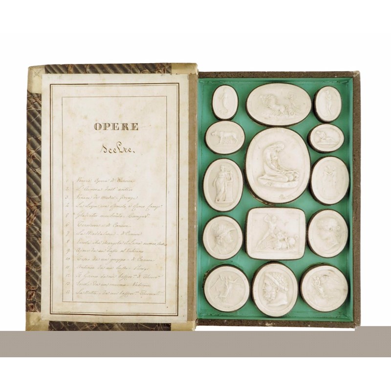 An early 19th century Italian Grand Tour 'book' of plaster intaglios, titled 'LIBEROTTI IMPRONTE, OPERE SCELTE', with a hinged cover revealing fourteen medallions after Canova, Thorwaldsen and the antique, with a titled list of works to the inside of the lid, 25.3cm x 16.5cm.