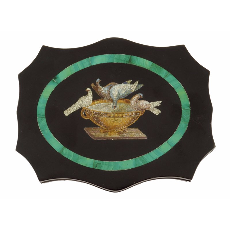 A late 19th century Italian micromosaic paperweight, of serpentine outline, the centre inlaid with the 'Doves of Pliny', within a malachite band, 14.5 x 18cm.