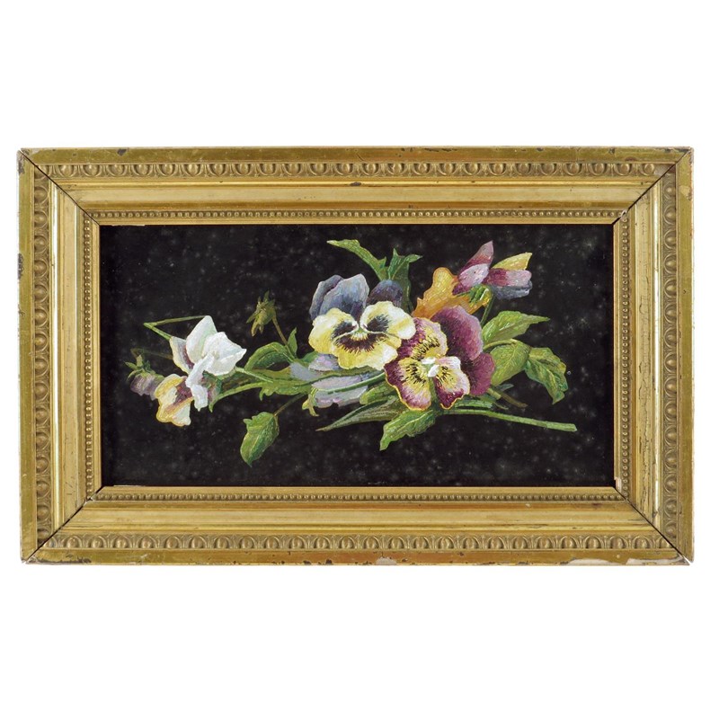 A late 19th century Italian Vatican workshop micromosaic plaque, depicting pansies within a giltwood and composition frame, the reverse with a printed paper label inscribed 'REV. FABB CA DI S. PIETRO IN VATICANO', with ink inscriptions '1269 lira 190', and with the buyer's name and address in pencil, the plaque 15.5 x 29.5.