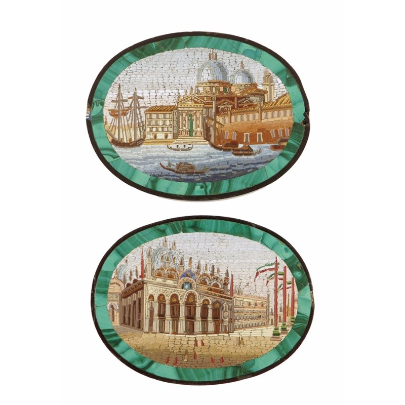 A pair of Italian micromosaic oval paperweights, inlaid with views of Venice: St. Marks Basilica and Santa Maria della Salute, each within a malachite border, late 19th / early 20th century, 7.7 x 10cm. (2)
