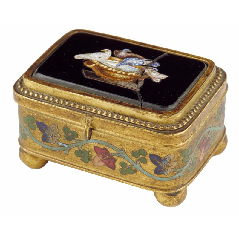 A late 19th century gilt metal trinket box, the hinged lid inset with a micromosaic panel depicting the 'Doves of Pliny', cracked, 3.8cm high, 7cm wide.
