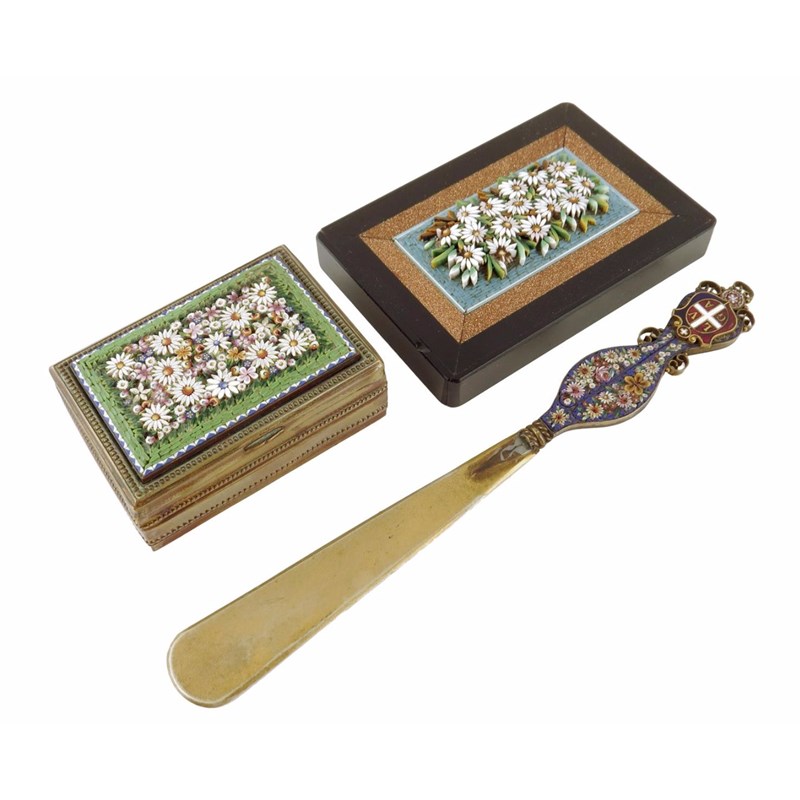 An Italian micromosaic paperweight, inlaid with a central panel of flowers, a gilt metal box, the hinged lid inlaid with a panel of flowers, together with a gilt metal paper knife, the handle decorated with flowers and with a coat of arms for Lugano, late 19th / early 20th century, 20.5cm (max). (3)
