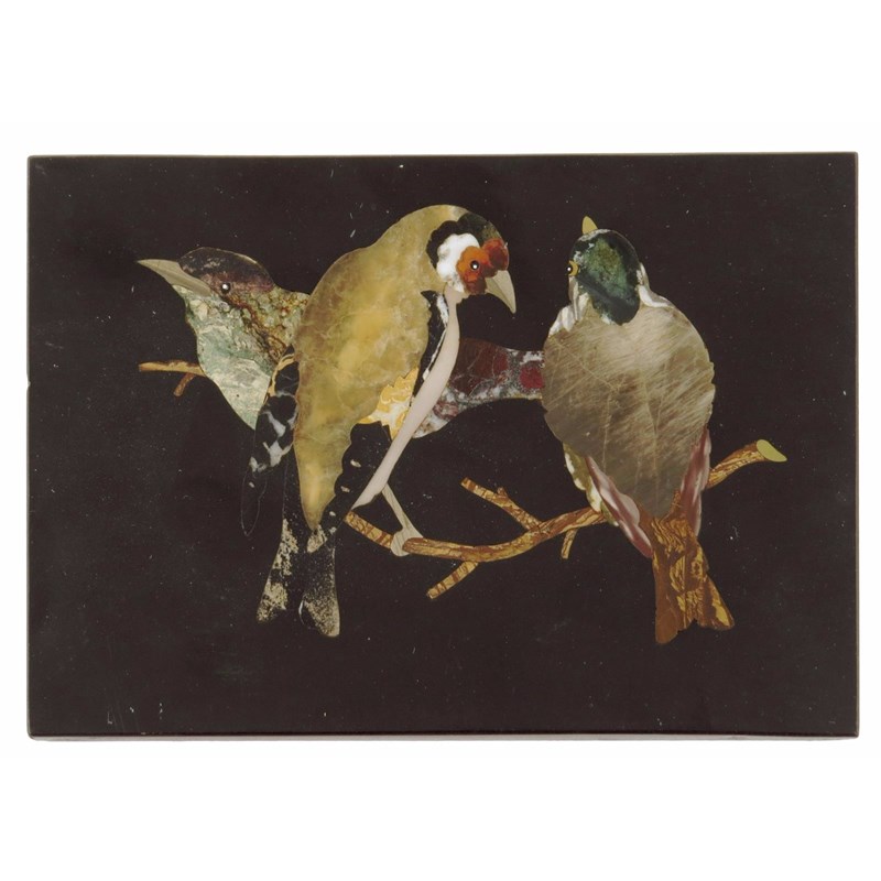 A late 19th century Italian Florentine pietra dura paperweight, inlaid with a goldfinch and two other birds perched on a branch, the underside indistinctly inscribed with names, the number '2169' and 'Firenze', 9.5 x 14.1cm.