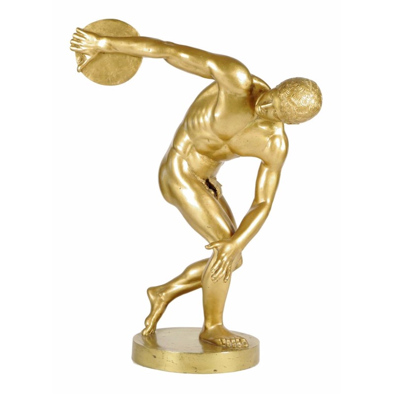 After the antique. An Art Deco gilt bronze figure of Discobolus, standing on a circular plinth, 63cm high, 45cm wide.