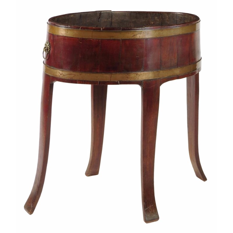 A teak and brass bound planter by Maple & Co., the interior with an associated lift-out copper liner, with lion's mask ring handles, the base with an oval brass plaque, early 20th century, 76.4cm high, 85.1cm wide, 53.5cm deep.