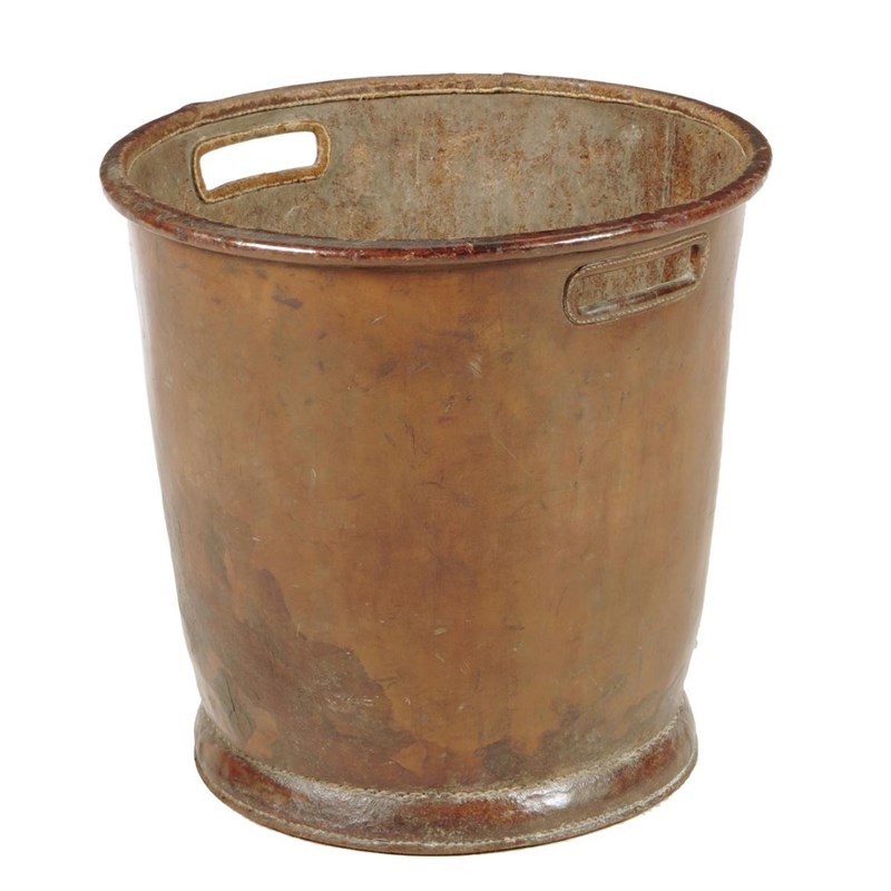A leather bucket, with two pierced handles, 39.1cm high, 40.8cm diameter.