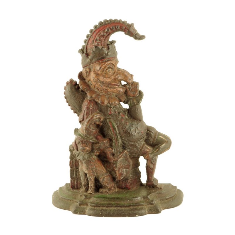 A Victorian painted cast iron doorstop in the form of Punch, reclining on a stack of books with his dog, 31.4cm high.