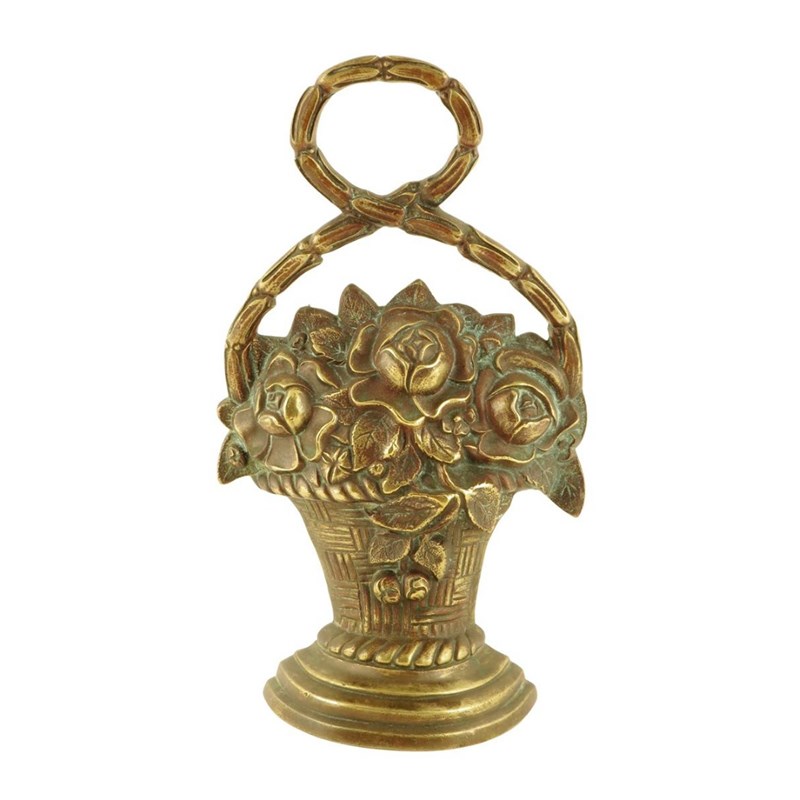 A Victorian brass doorstop in the form of a basket of flowers, with a laurel wreath handle, 32.1cm high.