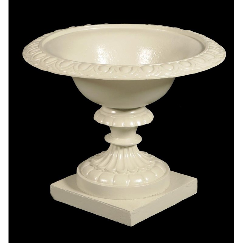 A late Victorian painted cast iron urn, with an ovolo moulded rim, the edge of the bowl with impressed registration and kite marks and 'No 3', on a fluted and lobed foot, 39cm high, 47cm diameter.