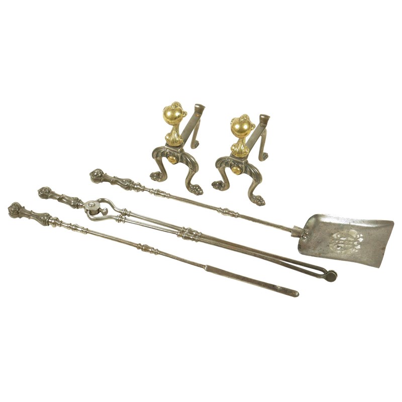 A set of three early Victorian steel fire tools, each with a lappet cast handle and knopped stem, with a pierced pan, 71.5cm long (max), together with a pair of steel and gilt brass andirons with a claw and ball finial on lion's paw feet, with traces of a registration number. (5)