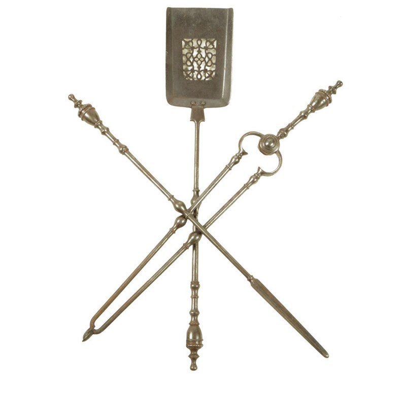 A set of 19th century steel fire tools, each with a beaded urn handle and a knopped stem, with a pierced pan, 74.6cm long (max). (3)