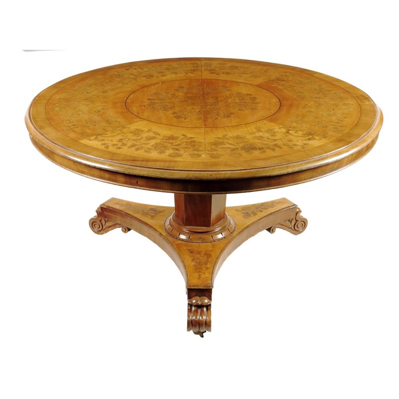 A Victorian mahogany and satinwood floral marquetry centre table, the circular tilt-top crossbanded and inlaid with bands of flowers on faceted stem and a conforming platform base with scroll feet and castors, 73.7cm high, 135cm diameter.