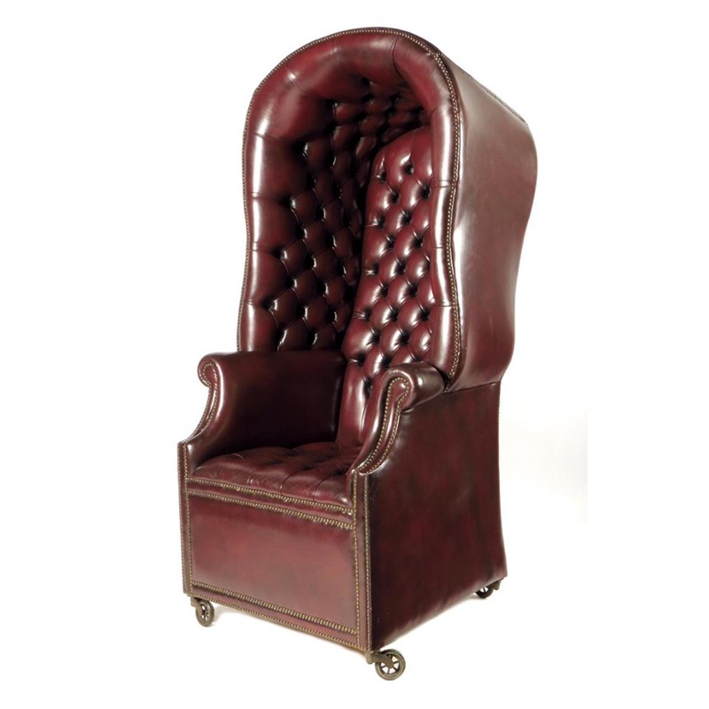 A leather porter's chair, with a button back and seat with studded burgundy leather upholstery on spoke castors, mid 20th century.