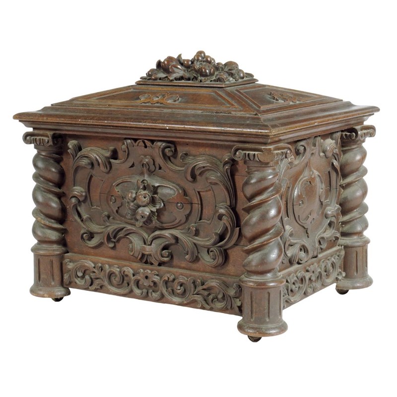 A Victorian carved oak ice box, of sarcophagus shape, the hinged lid with a fruit and leaf panel, the interior with a lift-out metal liner with spiral twist columns and leaf carved cartouche panels, on brass castors, 54.5cm high, 66.8cm wide, 52cm deep.