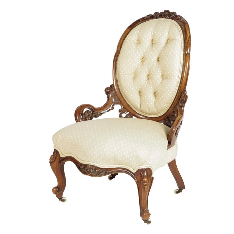 A Victorian walnut nursing chair, with a carved and moulded frame with later fabric on cabriole legs and ceramic castors.