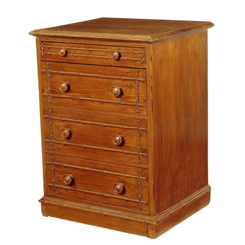 A late Victorian pitch pine chest by Howard & Sons, with four drawers decorated with faux bamboo mouldings, one with a division and stamped 'HOWARD & SONS BERNERS ST.' and with a paper trade label, with Hobbs brass locks, 77cm high, 56.4cm wide, 49cm deep.