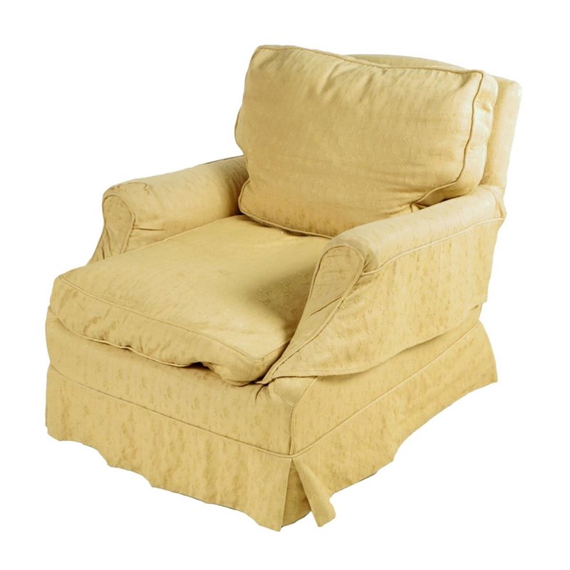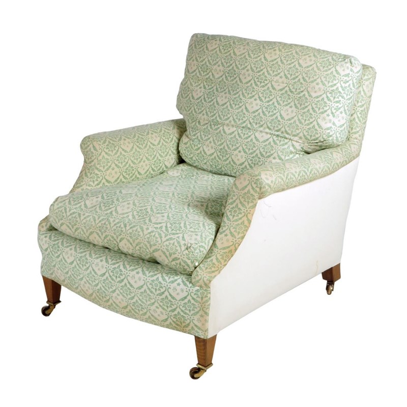 A Lenygon & Morant 'Howard' easy armchair, with loose covers and part 'H & S' monogrammed ticking, on beechwood supports and brass castors, the underside with a label inscribed A 'LENYGON & MORANT LTD MAKERS OF HOWARD CHAIRS AND SETTEES, 48 SOUTH AUDLEY ST. LONDON W.1. E.G. 3263', the back legs both stamped.