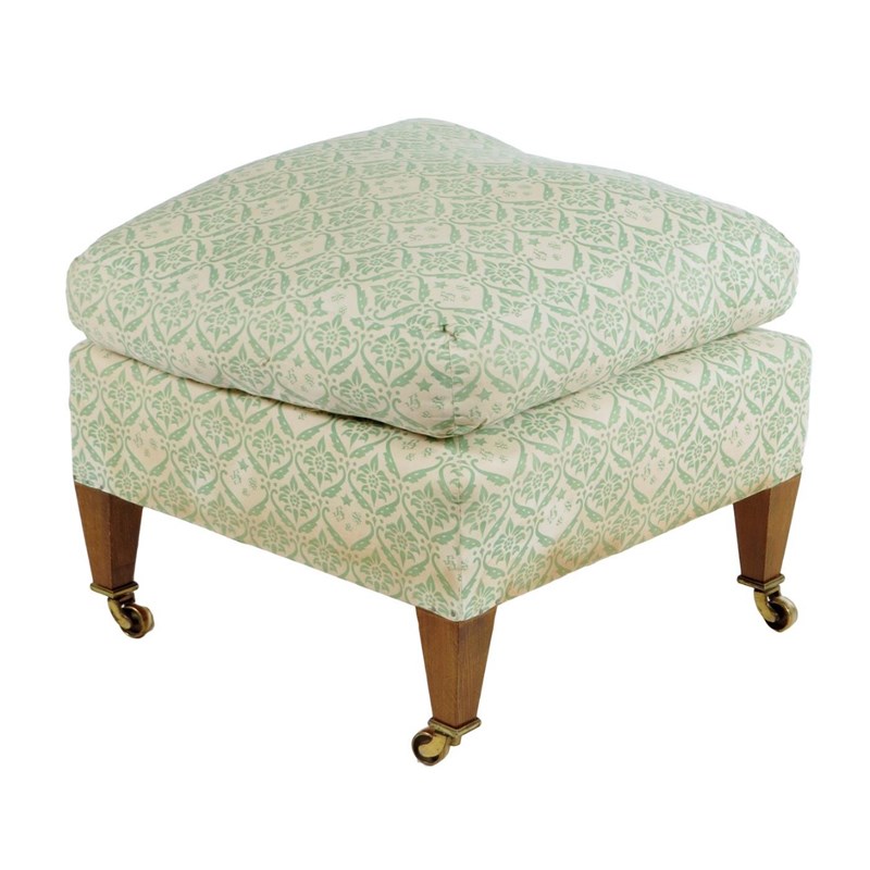A Lenygon & Morant 'Howard' stool, with loose covers and 'H & S' monogrammed ticking, on beechwood tapering legs and brass castors, the underside with a label inscribed 'LENYGON & MORANT LTD MAKERS OF HOWARD CHAIRS AND SETTEES, 48 SOUTH AUDLEY ST. LONDON W.1. E.G. 2988', 44cm high, 54cm square.