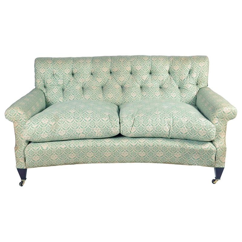 A Lenygon & Morant 'Howard' two seater sofa, with a button back and a concave front, with loose covers and 'H & S' monogrammed ticking, on stained beechwood supports and brass castors, the underside with a label inscribed 'LENYGON & MORANT LTD MAKERS OF HOWARD CHAIRS AND SETTEES, 48 SOUTH AUDLEY ST. LONDON W.1, 5/2552 RH', one back leg stamped 'HOWARD CHAIRS 48 STH AUDLEY ST. 5/2552',