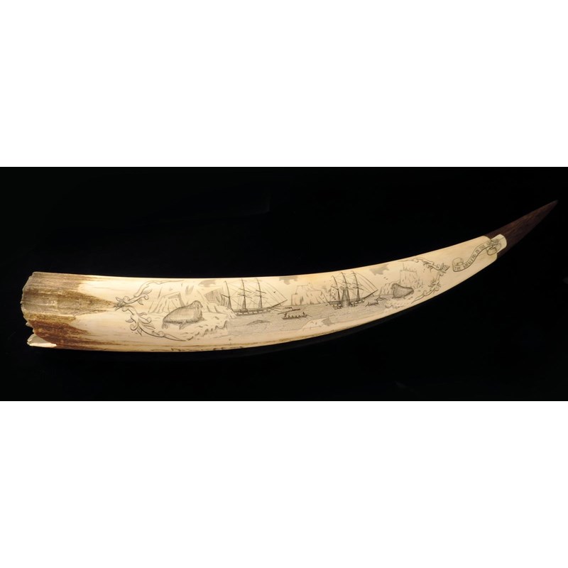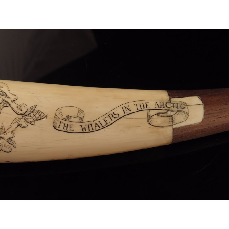A sailor's scrimshaw walrus tusk, one side engraved with a whaling scene flanked by a pair of walrus, with an inscribed banner 'THE WHALERS IN THE ARCTIC', with a replaced tip in wood, 52.4cm long.