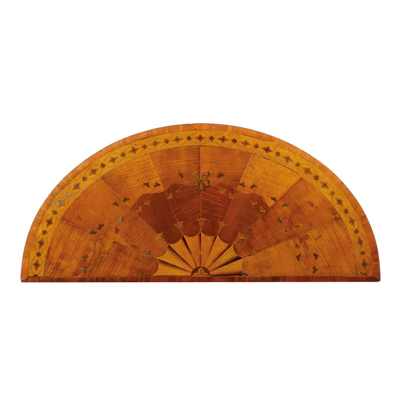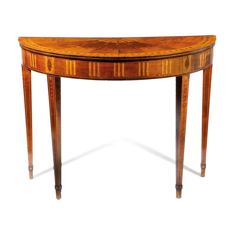 A GEORGE III HAREWOOD AND MARQUETRY DEMI-LUNE CONSOLE TABLE