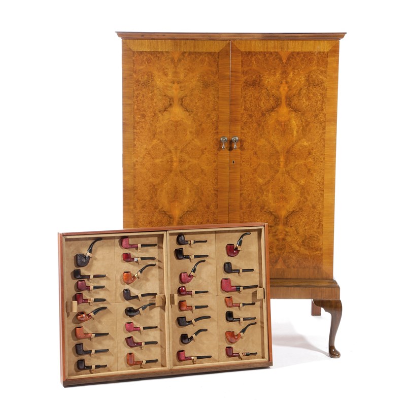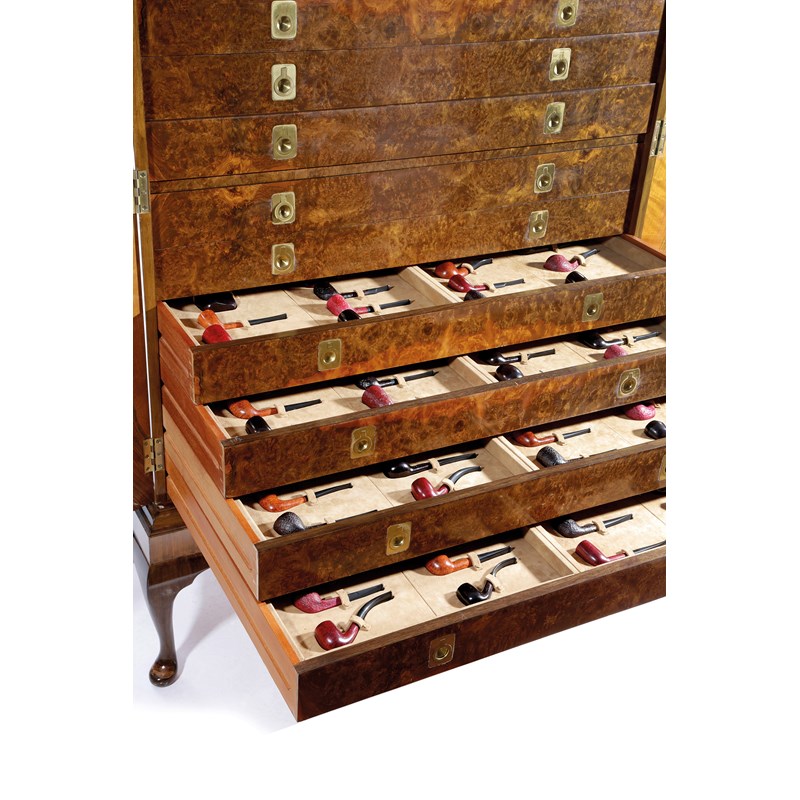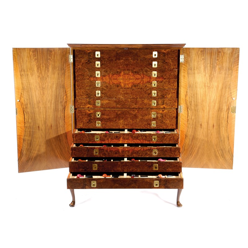 the Queen Anne style walnut cabinet with a moulded cornice above a pair of doors, holding twelve numbered drawers fitted to hold three-hundred and sixty-six Dunhill pipes, each stamped 'Dunhill' and with a shape number, the cabinet on cabriole legs