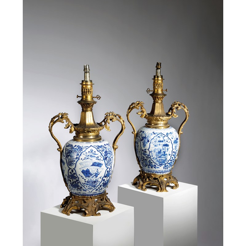of ovoid shape, each decorated with cartouches of fan shaped panels and treasures, interspersed with floral sprays and flowering branches, beneath ruyi and flowerhead shoulders and floral feet, with scrolling foliate ormolu mounts and an oil lamp cover, now fitted for electricity (2)