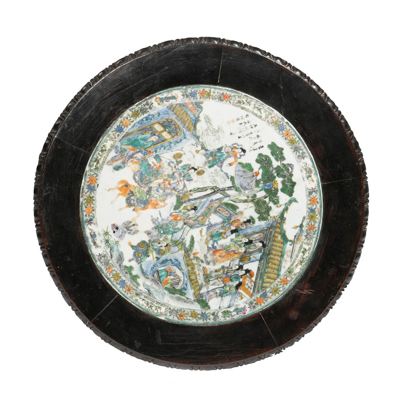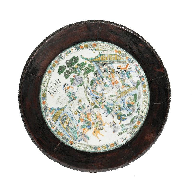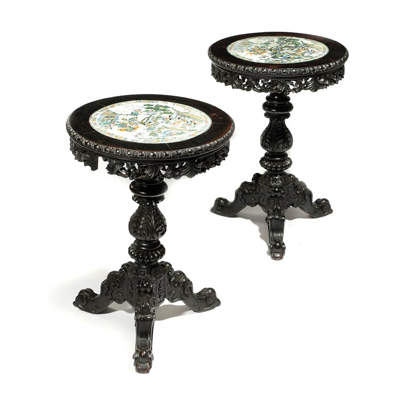 each top inlaid with a central famille verte plaque with an inscription, above a pierced foliate frieze, on a turned and carved baluster column support and a tripod base with foliate scrolls (2)