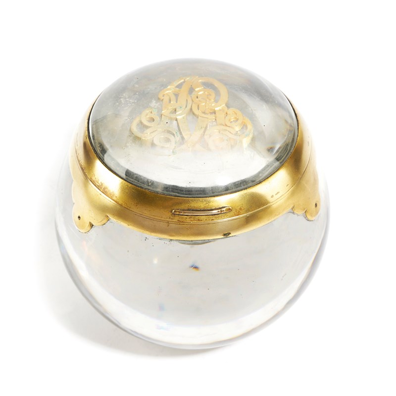 of globular form, with gilt metal mounts, the hinged cover with the 'AR' monogram of Alfred de Rothschild, revealing a lift-out glass liner
