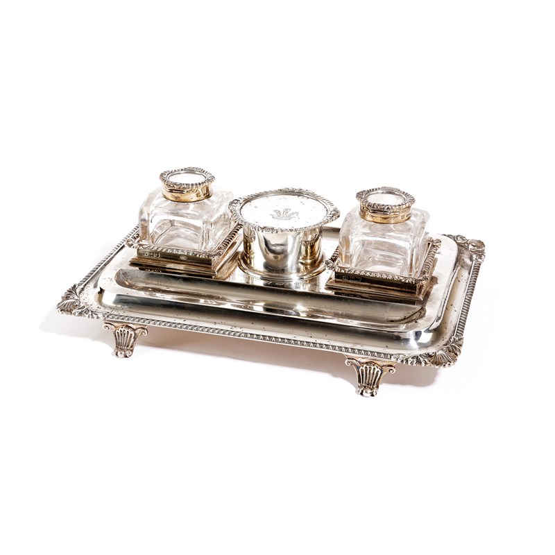 of rectangular form, with gadroon and foliate shell borders, mounted with two cut-glass inkwells and a central circular box, with two pen wells and engraved with Prince of Wales feathers issuing from a crown, inscribed 'From C. M. Oct. 8th 1912', lacking nuts to underside