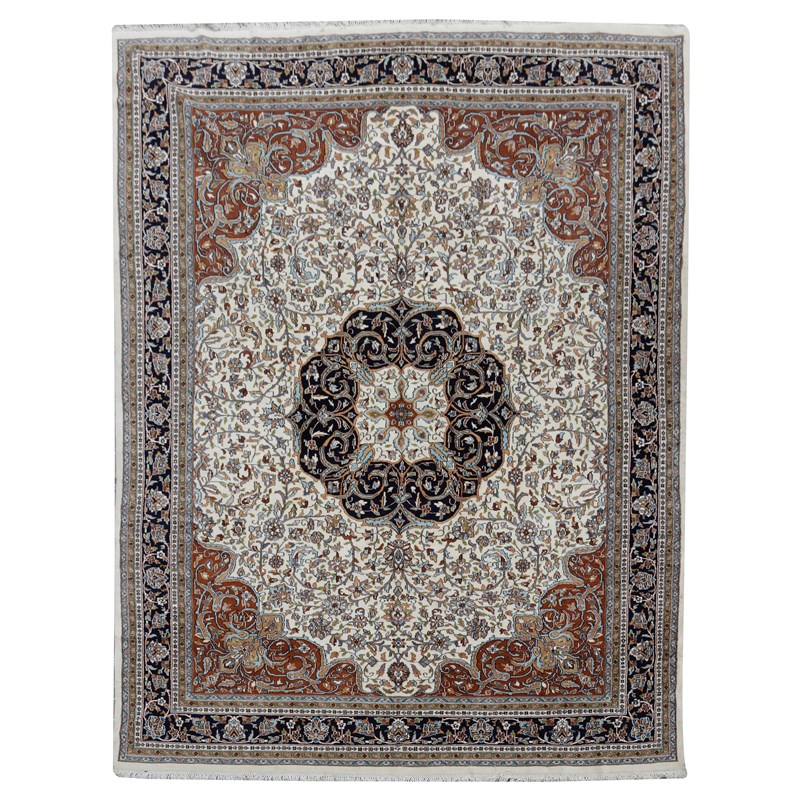 the cream field of scrolling vines centred by a deep terracotta medallion framed by indigo meandering vine borders, flanked by lemon guard stripes, together with another modern Indian carpet (2)