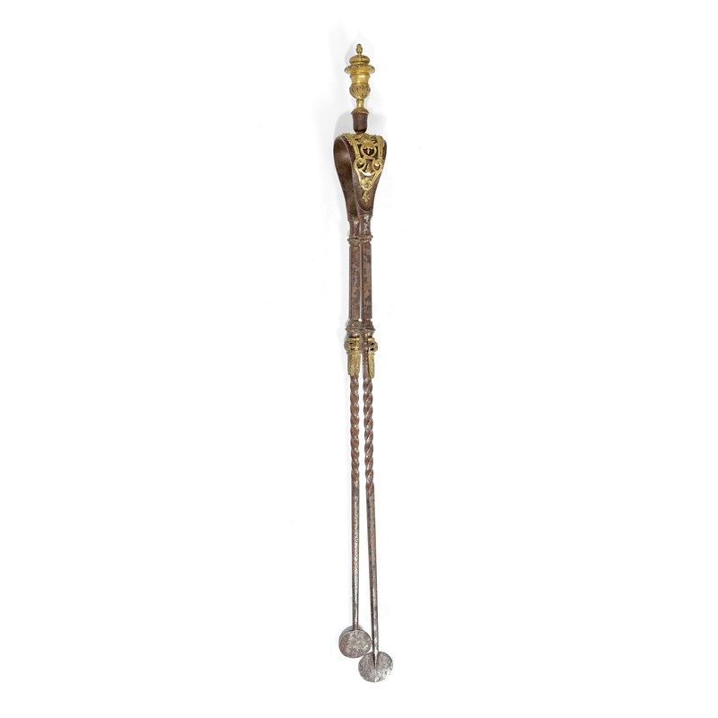 with cherubic faun figures playing music, interspersed with war trophies and doves of peace, with scrolling leaves and lion's masks, stamped '192', together with a pair of 18th century French steel and ormolu mounted fire tongs (2)