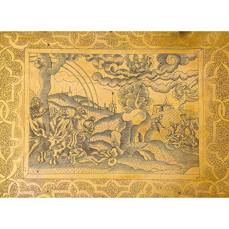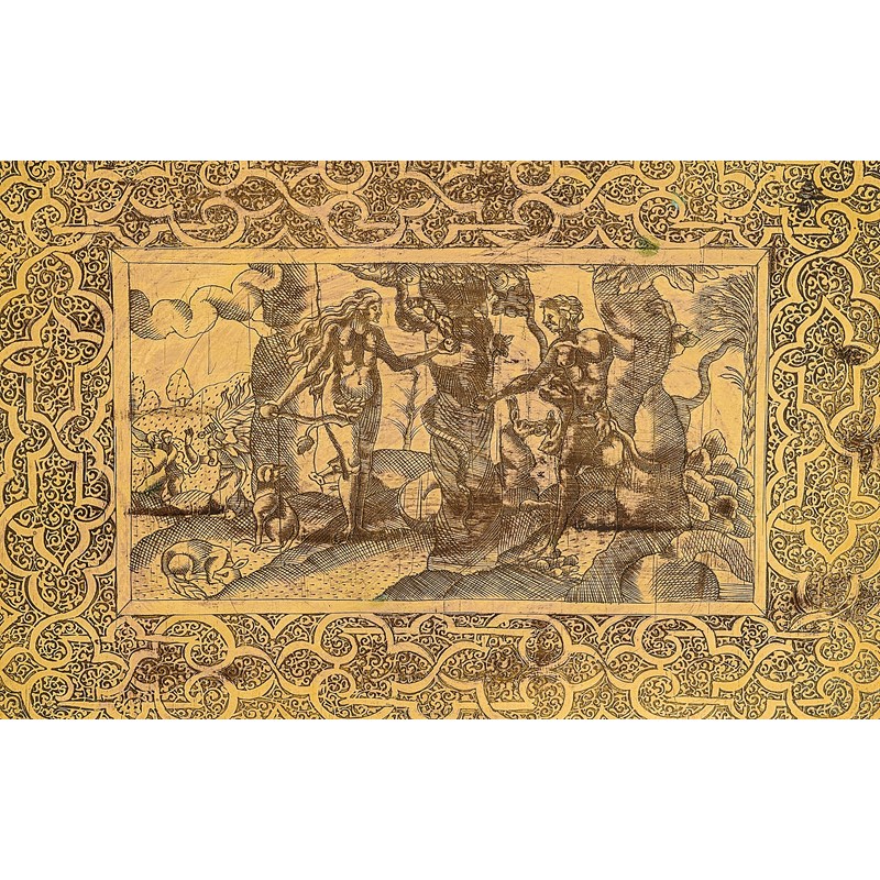 The scene of Adam and Eve is after a 16th century German woodcut by an artist referred to as ‘Master SHF’, a version of which is held at The Minneapolis Institute of Art. The engraved depiction of Adam and Eve is very much in the style of Virgil Solis who produced a series of illustrations for the Bible from 1560.