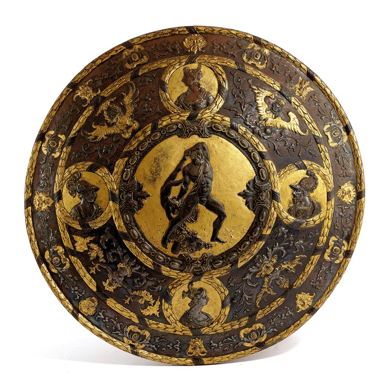 Rothschild Archive, London, Manuscript: 000/174/C/3, Christie, Manson & Woods Probate Valuation of 'The Estate of Alfred C. de Rothschild, Esq. C.V.O. Deceased, Halton House Tring'. 1918. Listed as 'An Italian circular shield, chased with Hercules and Lycas on gold and blue ground with medallion heads and caryatid figures round the border, 16th century, £200.0.0.''