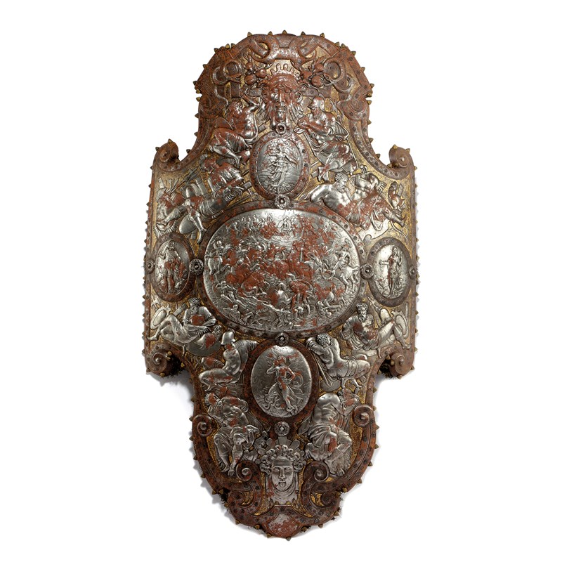 Another example of this form of shield, purported to be after an original in the National Museum of Denmark, Copenhagen, is held by Museo Stibbert, Florence. It may be compared to an example of Libaert's work produced for the coronation of the Holy Roman Emperor Maximillian II in 1564 and which is held in Skokloster Castle in Sweden.