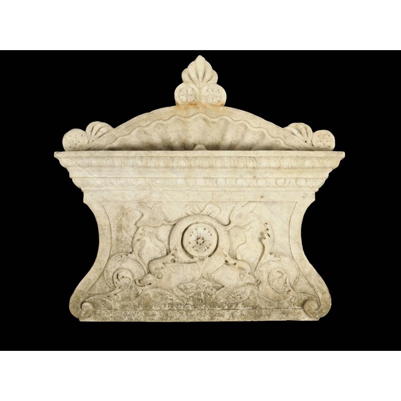 An Edwardian marble architectural fragment, the shell pediment decorated with anthemion motifs above a pair of entwined dolphins, 50.3cm high, 53.3cm wide.