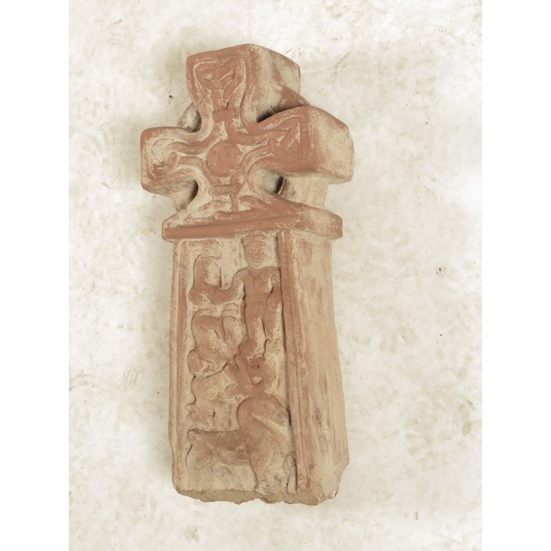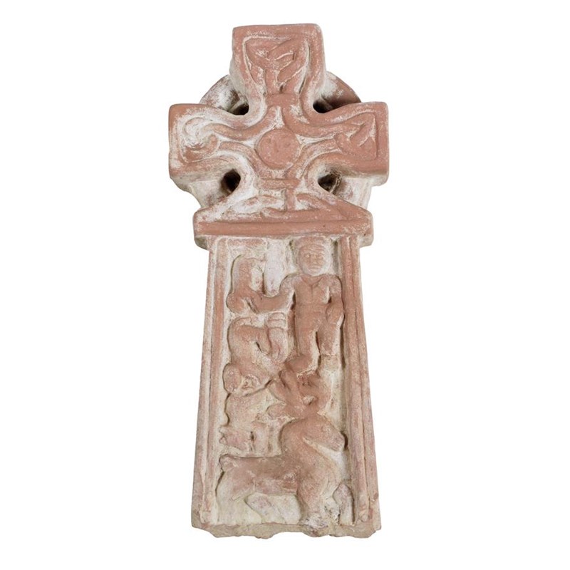 A carved red sandstone Celtic style cross, the stem decorated with figures, 47.8cm high, 19.4cm wide