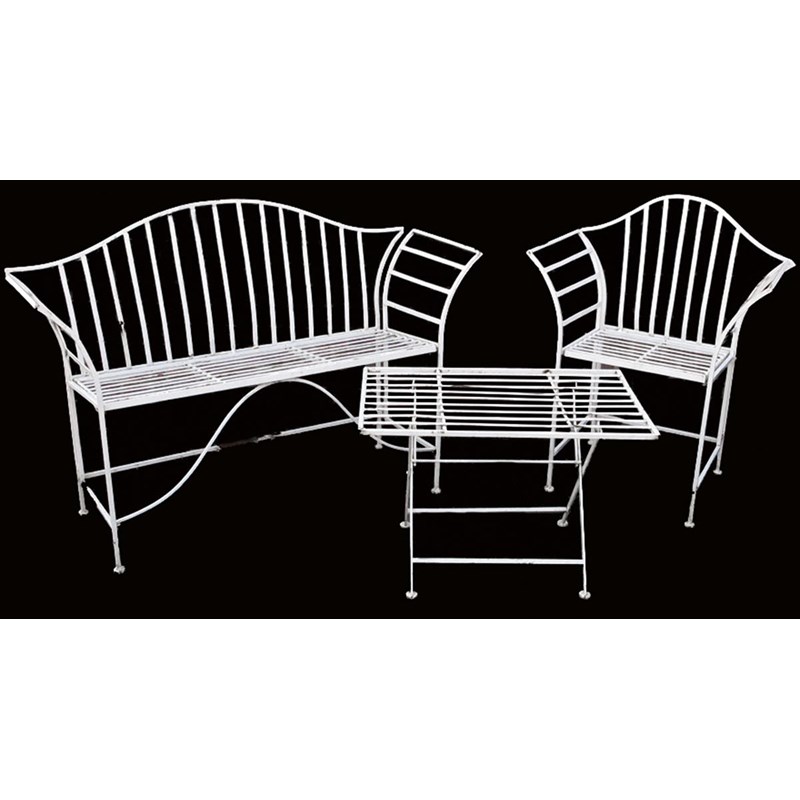 A white painted wrought iron garden seat in Regency style, with a serpentine back and scroll arms, together with a matching armchair and table, 134.5cm wide. (3)