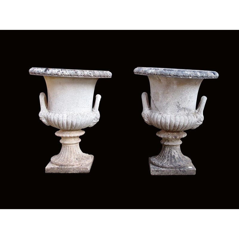 A pair of composition stone garden urns, of campana shape with a pair of handles with satyr masks, on a fluted socle, 72.5cm high, 60.5cm wide. (2)