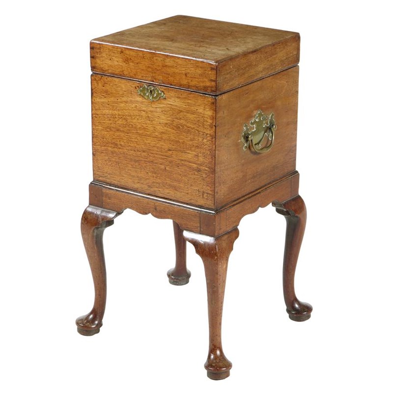 A George II mahogany cellaret, the hinged top revealing a vacant interior, with brass side carrying handles, above an arc d'arbelette apron on cabriole legs and pad feet, 59.3cm high, 37cm wide, 36cm deep.