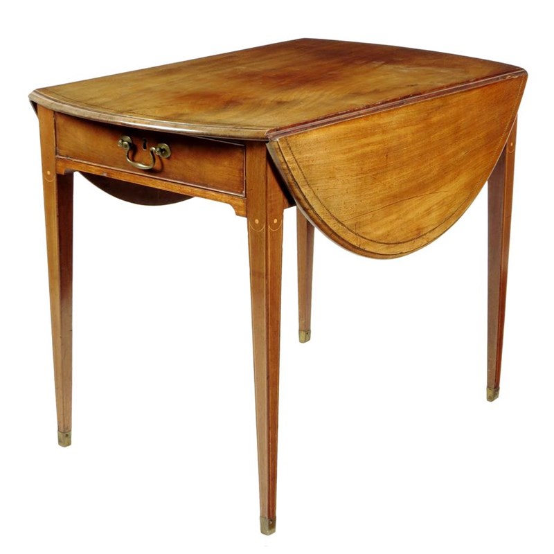A George III mahogany bowfront Pembroke table, the oval drop-leaf top inlaid with barber's pole stringing above a divided frieze drawer on square tapering legs inlaid with boxwood stringing, 69.4cm high, 90 x 108.5cm (open).