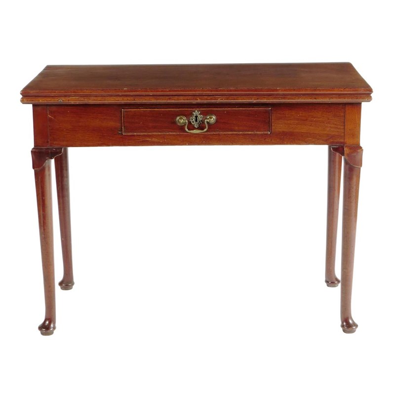 A George II mahogany card table, the fold-over top revealing a blue baize lined playing surface, with counter-wells and candlestands, with a frieze drawer on lappet headed legs, 73.8cm high, 96.7cm wide, 45.7cm deep.