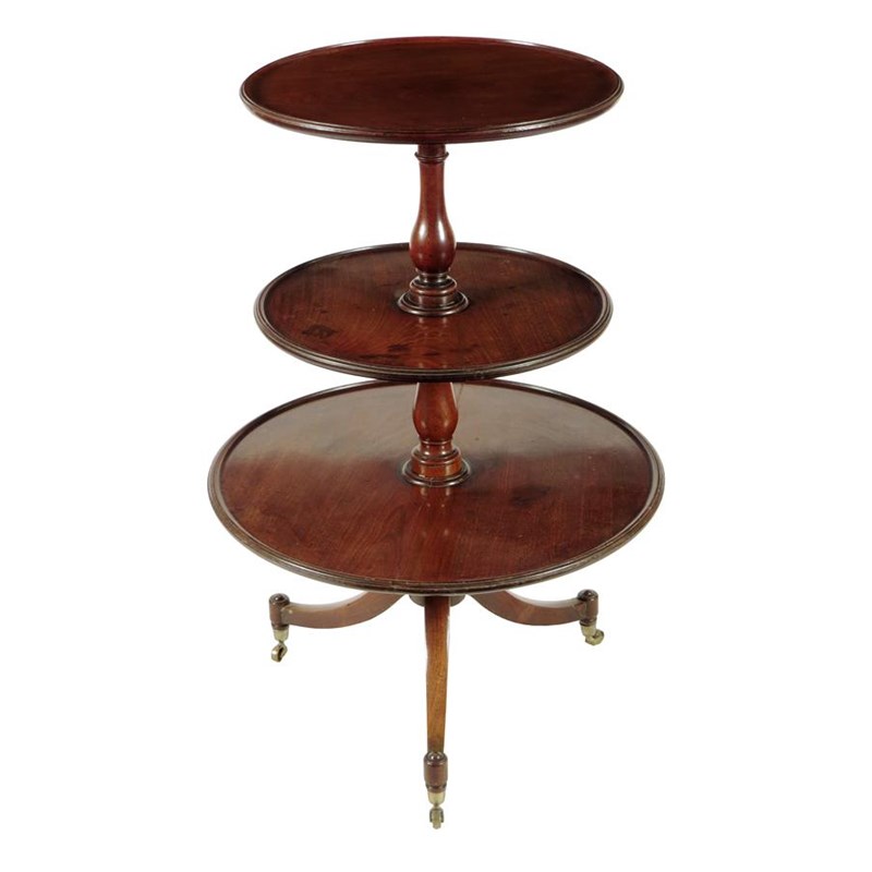 A George III mahogany dumb waiter, with three revolving dished tiers, 108cm high, 74cm diameter.