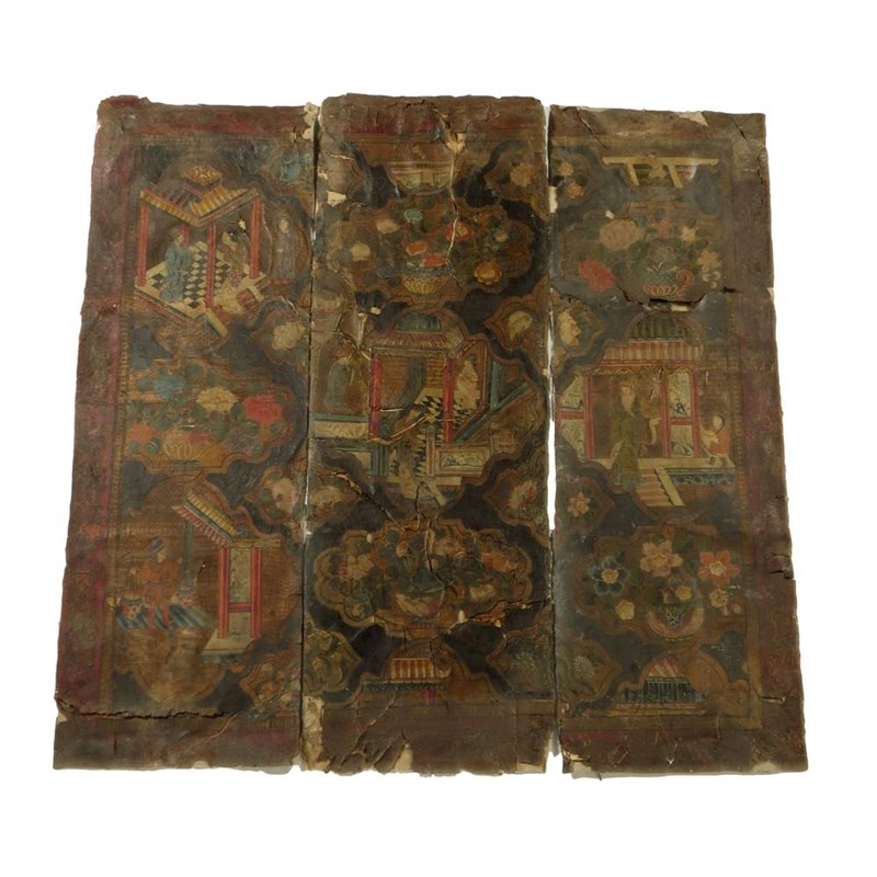 Three leather panels, painted with chinoiserie decoration and urns of flowers, 18th century, originally from a screen, 150.5 x 48.5cm.
