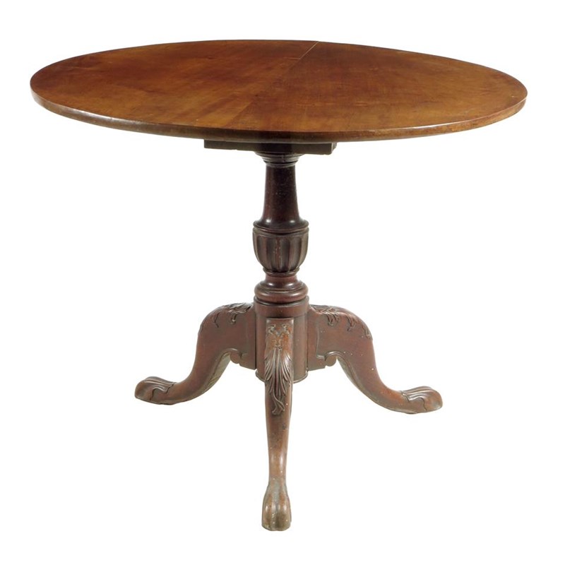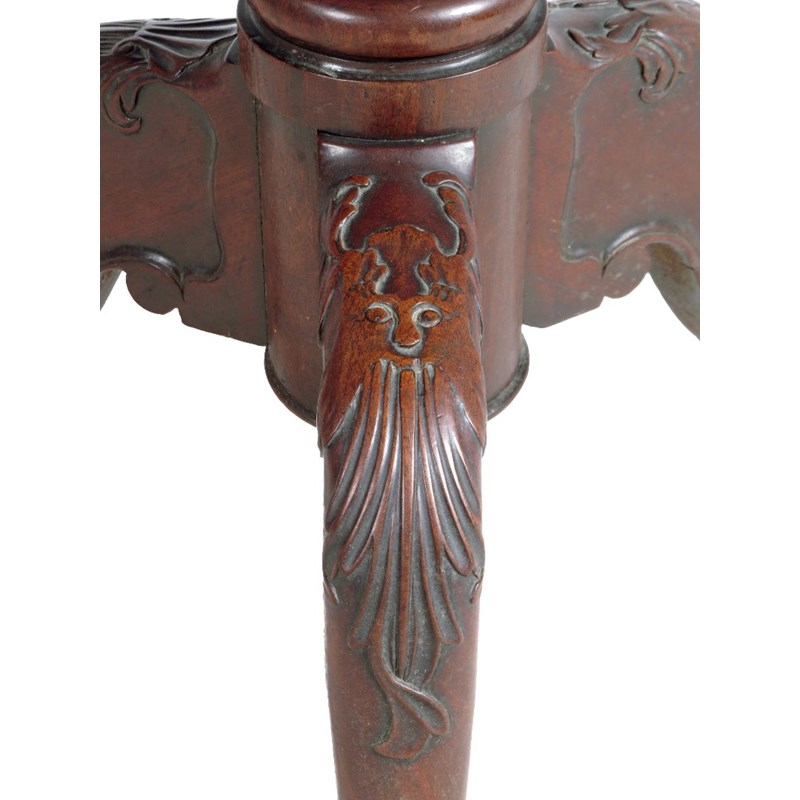 An early George III Irish mahogany tripod table, the circular tilt-top revolving on a birdcage, on a fluted baluster stem, on carved legs, two with a grotesque mask, the other with a stylized shell, 73.8cm high, 91.2cm diameter.