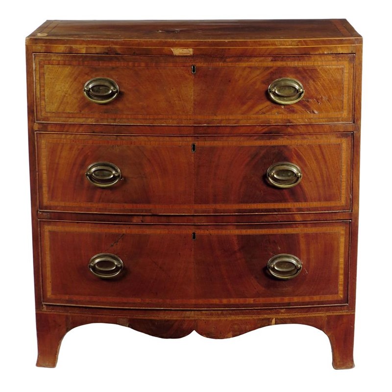 A late George III mahogany bowfront chest, inlaid with stringing and satinwood banding, the crossbanded top above three long graduated drawers and bracket feet, 84cm high, 81.5cm wide, 47cm deep.