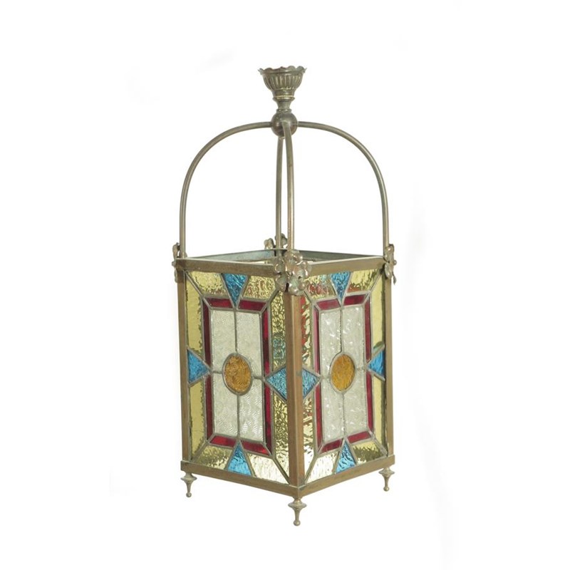 A late Victorian brass and leaded stained glass hall lantern, 52.9cm high, 20cm wide.