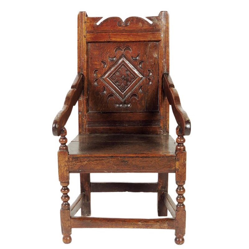 A late 17th century oak open armchair, the panelled back carved with foliate designs within a lozenge, with scroll arms on bobbin turned legs.