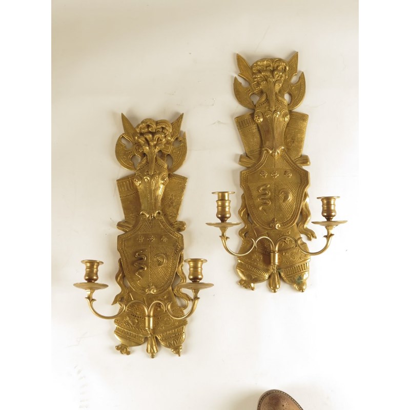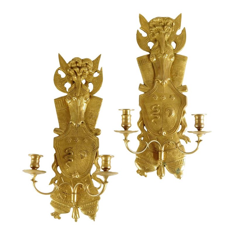 A set of four Restauration ormolu wall lights, each with a backplate decorated with a coat of arms and war trophies, with twin scroll branches and turned nozzles, 53cm high, 28cm wide. (4)